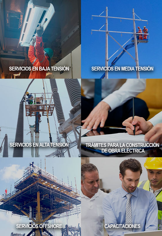 Servicios y ejecución de proyectos, construcción y mantenimiento en líneas aéreas y subterráneas desde 4.5 kV, 13.8 kV y 34.5 kV para la iniciativa privada, CFE, gobierno del estado y municipal. Construcción y mantenimiento de líneas aéreas y subterráneas, así como la elaboración de análisis y presupuestos de obra; pruebas eléctricas; mantenimiento a subestaciones eléctricas particulares; lavado de aislamiento en muerto con trapo y equipo a presión; mantenimiento a interruptores; elaboración de planos; suministro de materiales, herrajes y accesorios; mantenimiento y pruebas eléctricas a transformadores; elaboración de proyectos.